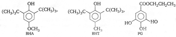 वे रासायनिक पदार्थ जो वसा तथा वसा युक्त पदार्थों से मिलकर उनके ऑक्सीकरण को रोकते हैं और उनके जीवनकाल को बढ़ाते हैं, प्रतिऑक्सीकारक कहलाते हैं। ये ऑक्सीजन के प्रति अत्यन्त क्रियाशील होते हैं। प्रतिस्थापी फीनॉलिक (phenolic) यौगिकों का उपयोग । प्रतिऑक्सीकारक के रूप में होता है। ब्यूटिल हाइड्रॉक्सी ऐनिसोल (BHA) (butyl hydroxy anisol) एक अविषैला (non-toxic) प्रतिऑक्सीकारक है जिसका व्यापारिक नाम सस्टेन (sustane) है। यह मक्खन के लिए अच्छा ऑक्सीकारक है। इसके अतिरिक्त ब्यूटिल हाइड्रॉक्सी टॉलूईन (BHT) 2, 3 – डाइतृतीयक ब्यूटिल p-ऐनिसॉल (2, 3 – ditertiary butyl p anisol) (BHA) तथा प्रोपिल-3, 4, 5 -ट्राइहाइड्रॉक्सी बेन्जोएट (propyl-3, 4, 5 -trihydroxy benzoate) जिसे प्रोपिल गैलेट (propyl gallate) या (PG) भी कहते हैं, आदि प्रतिऑक्सीकारक हैं। ये बहुत कम सान्द्रता (< 0.01%) पर प्रभावी होते हैं। ये भोज्य पदार्थ में उपस्थित आवश्यक वसीय अम्ल (fatty acids) तथा विटामिन (vitamins) के पौष्टिक मान (nutritional value) को बराबर रखते हैं।