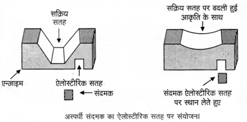 (i) औषध एन्जाइम की सक्रिय सतह पर संयोजन के लिए वास्तविक क्रियाधार से स्पर्धा करती हैं। ऐसी औषधों को स्पर्धा संदमक (competitive inhibitors) कहते हैं।